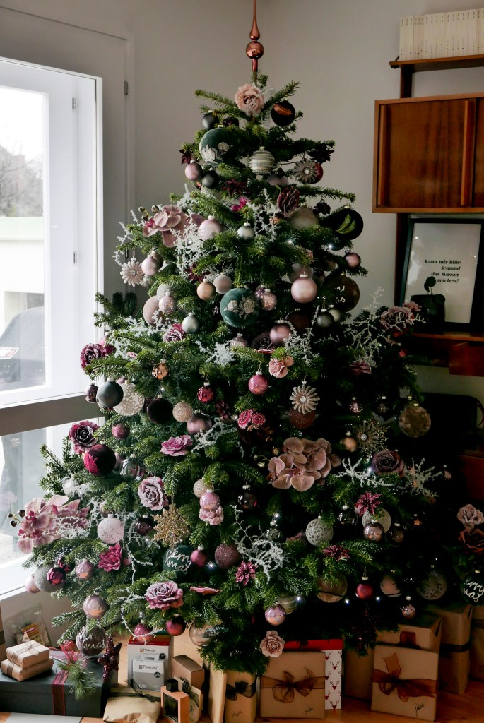 Fürs Schmücken hat er dann nochmal ca. drei Stunden benötigt und falls er euch in diesem Stil gefällt, hat mir auch ein paar Tipps genannt. Nie zu wenig Kugeln kaufen! Verschiedene Strukturen mischen. Von der Mitte nach außen schmücken. Kugeln dürfen nie auf Zweigen aufliegen. Nicht mit langen Bändern aufhängen, sondern am besten mit Häkchen.