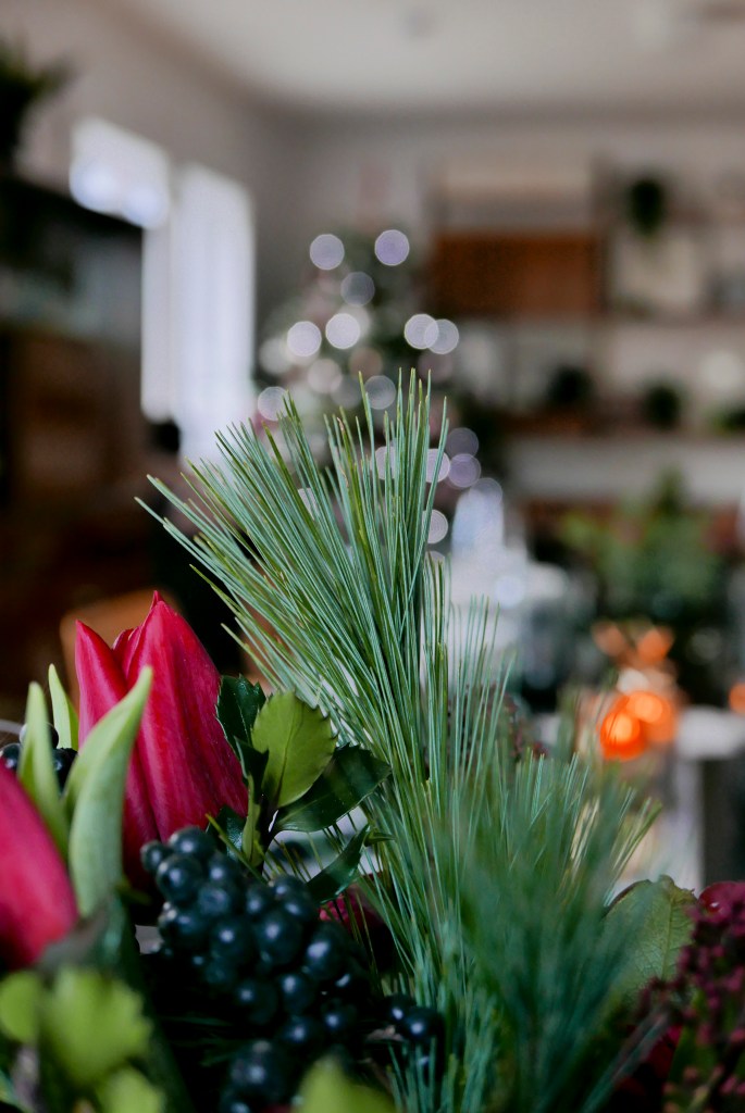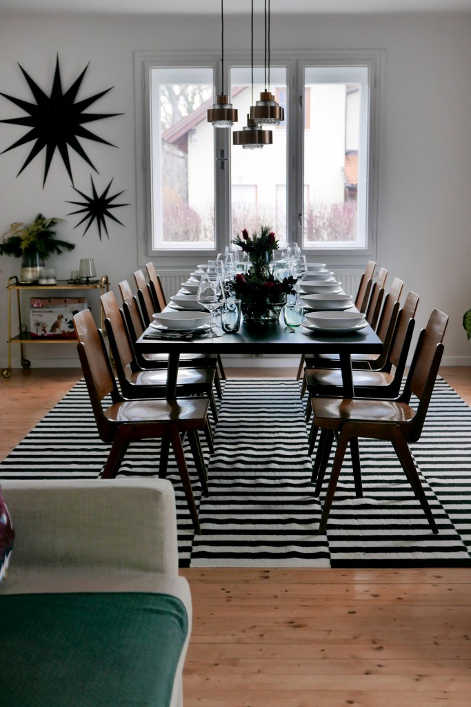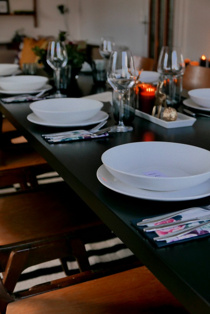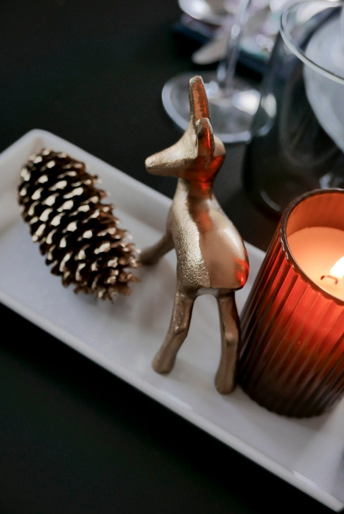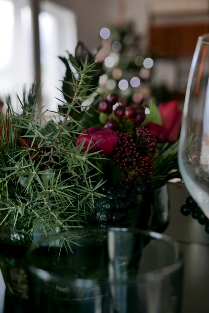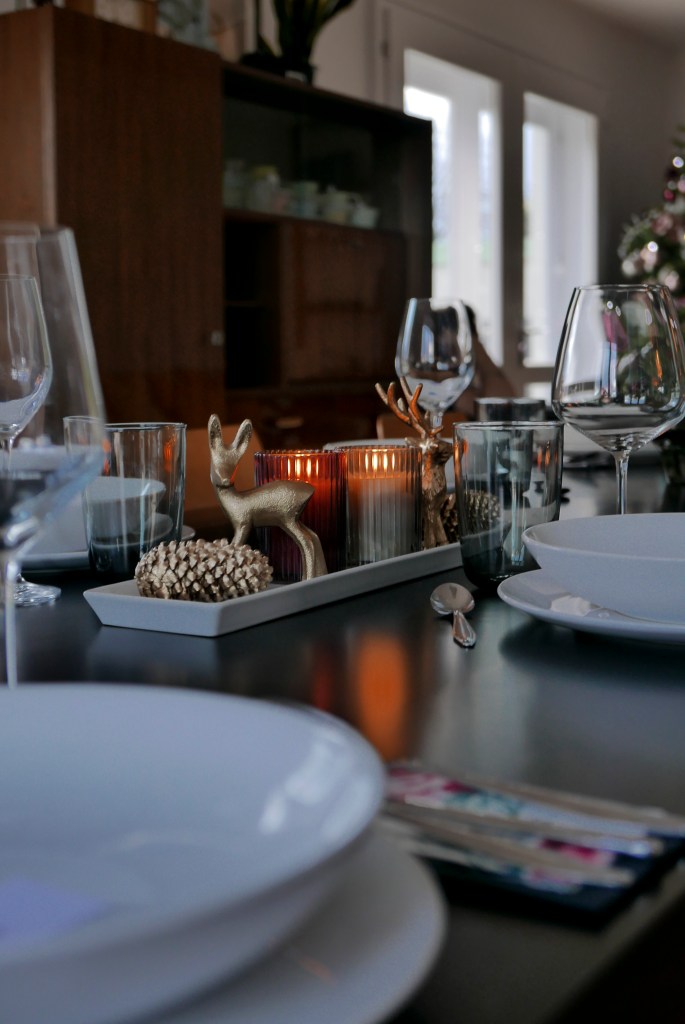 Wir haben das Häuschen natürlich dem Anlass entsprechend festlich geschmückt und ich habe versucht die Deko am Tisch dem Christbaumschmuck anzupassen.
