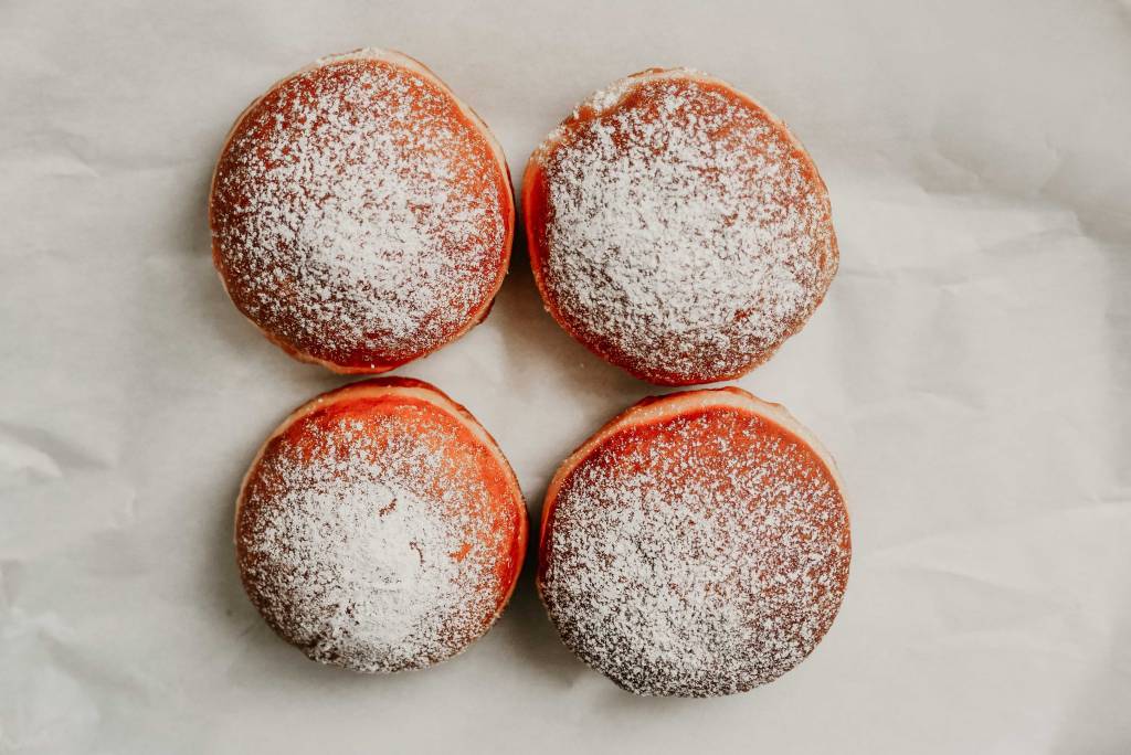 Der Teig sollte sich nach 30 Minuten wieder verdoppelt haben. Jetzt mit der Hand ein Stück herauszupfen, das 50 Gramm wiegen sollte. Man sollte das unbedingt mit einer Waage kontrollieren, sodass danach auch jeder Krapfen gleich groß ist! Jetzt braucht man ein bisschen Übung, denn die 50g-Stücke müssen nun „geschliffen“ werden. Dazu das Teigstück mit der flachen Hand auf die Arbeitsplatte drücken, mit der Hand gleichzeitig kreisen und immer enger werden bis man die Hand fast zu einer Faust geballt hat. Nun sollte man eine sehr glatte und kleine Teigkugel haben, die man nun auf ein Backpapier legt. Das macht man nun so lange, bis der Teig aufgebraucht ist. Die Kugeln nicht zu nahe nebeneinander hinlegen, da sie noch aufgehen. Jetzt sollte man wiederum Backpapier über die Kugeln legen und sie alle mit einem Backblech mit ordentlich gleichmäßigem Druck niederpressen. Diese „Ufos“ sollten nun noch einmal 30 Minuten zugedeckt (Backpapier und darüber Geschirrtuch) gehen.