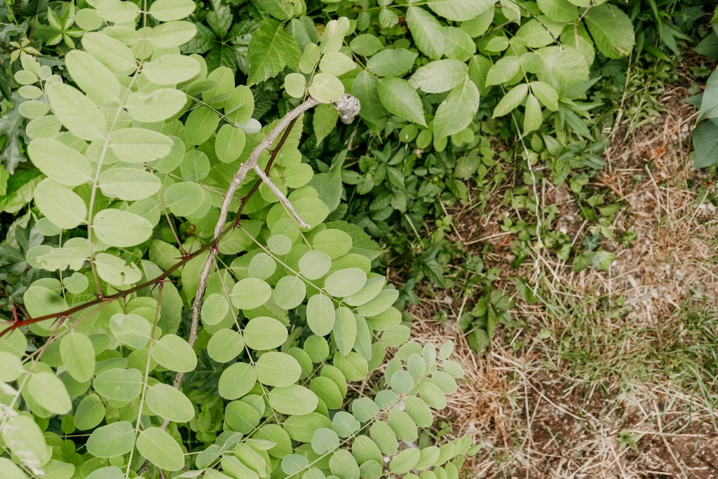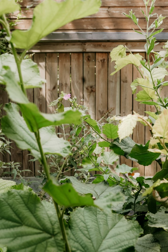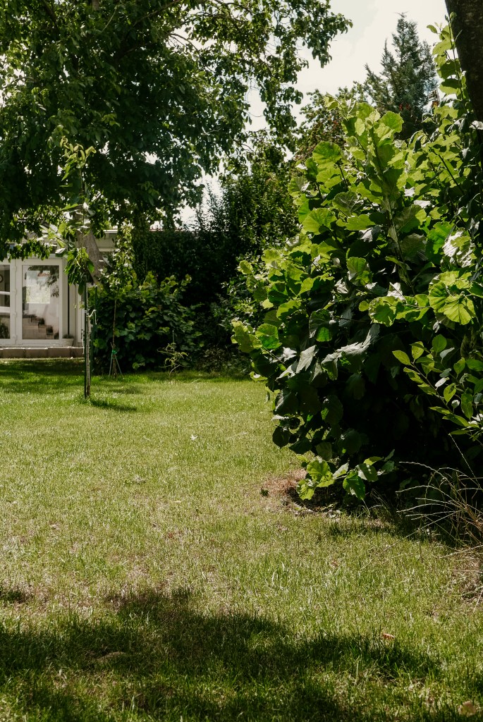 Wenn man nun weiter nach hinten in den Garten geht, haben wir an der Zaunseite die ursprünglichen Pflanzen unberührt gelassen. Das haben wir übrigens fast bei der gesamten Grundstücksgrenze so gemacht. Heuer, im zweiten Sommer nach dem radikalen Rückschnitt, sind wir schon ein bisschen dafür belohnt worden. Die alten Sträucher und Büsche sehen nämlich schon sehr hübsch aus. Wir versuchen im Garten alles möglichst natürlich zu halten, denn wir sind absolute Gegner von perfekt getrimmten Hecken. Da bleibt seitlich am Zaun entlang mitunter auch einiges an wilder Wiese für die Bienen stehen. Wir mögen das sehr; vor allem im Kontrast mit dem restlichen schön gemähten Rasen.