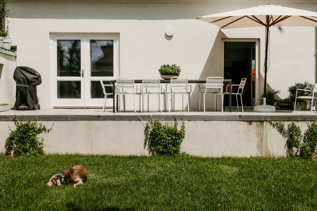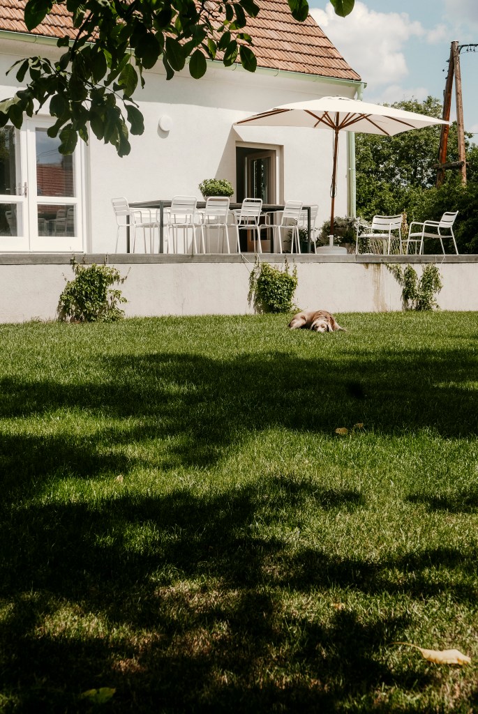 Vor dem Beet befinden sich noch die Bäume, die wir neu gesetzt haben; ein Apfelbaum, eine Marille und eine Kirsche. Auch die brauchen natürlich noch einige Jährchen bis sie stattliche Bäume sind. Unter dem großen, alten und schattenspendenden Nussbaum hingegen lässt es sich schon gut aushalten, denn da ist auch mein Hängesessel angebracht. Von dort sieht man auch schön auf die Terrasse, die natürlich unser Herzstück im Garten ist.