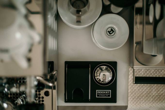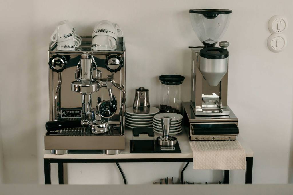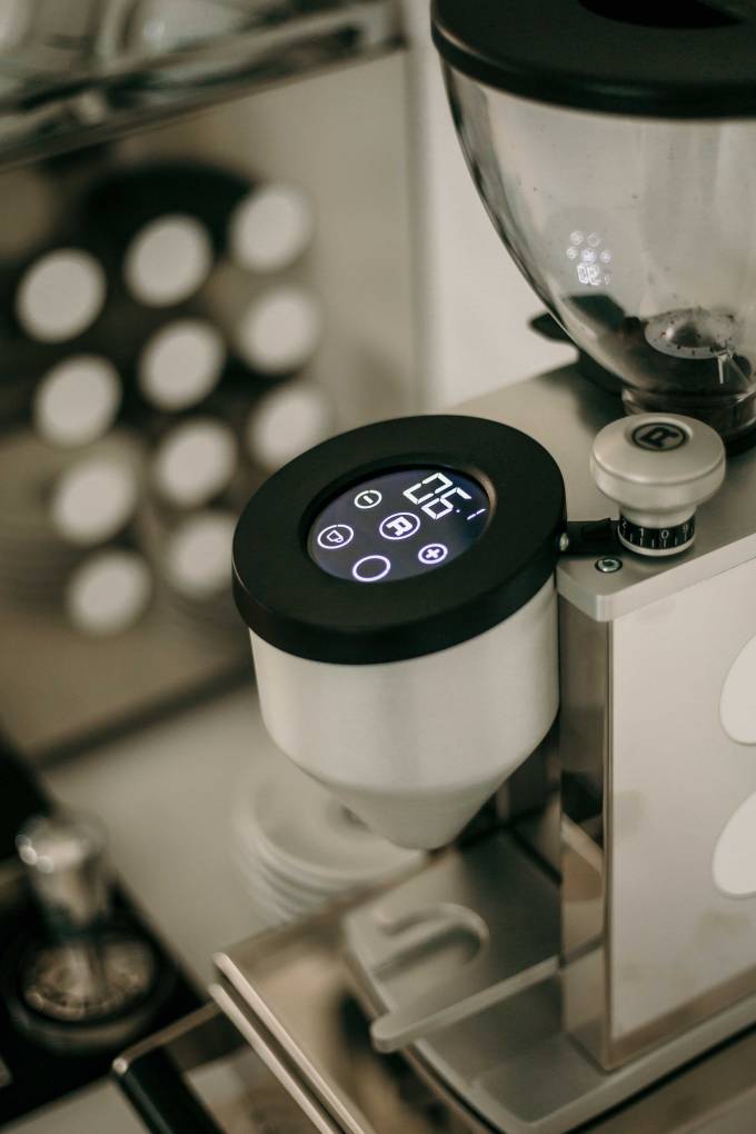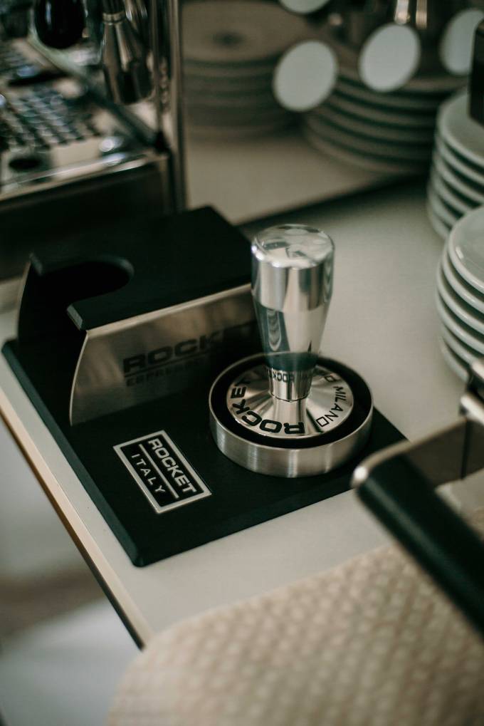 Viele sagen ja, dass die Mühle fast noch wichtiger als die Maschine selbst ist. Sie ist jedenfalls super, mahlt extrem regelmäßig und hat auch ein Touchdisplay. Dazu kam noch ein Tamper von Rocket und auch gleich eine Tampingstation, die die Arbeit sehr erleichtert.